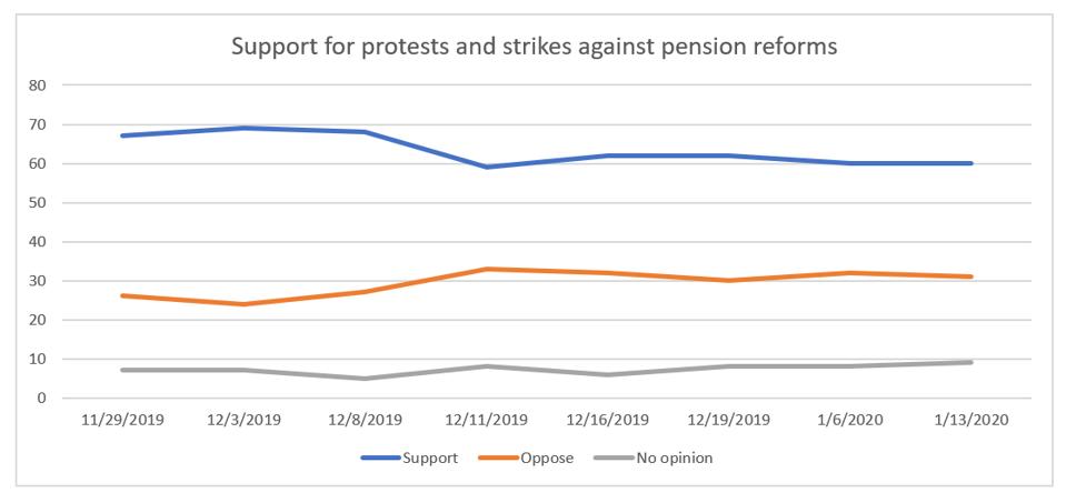 Yet public support for the strikers’ battle to defend one of the most generous pension systems in the world remains strong. According to a poll published Sunday [Jan 12], 44% support or sympathize with the strike, outweighing the 37% who are opposed or hostile to it.