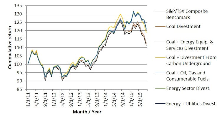 In a recent study at the University of Waterloo, we analyzed what happens if different divestment strategies are applied to the Canadian stock index TSX 260.